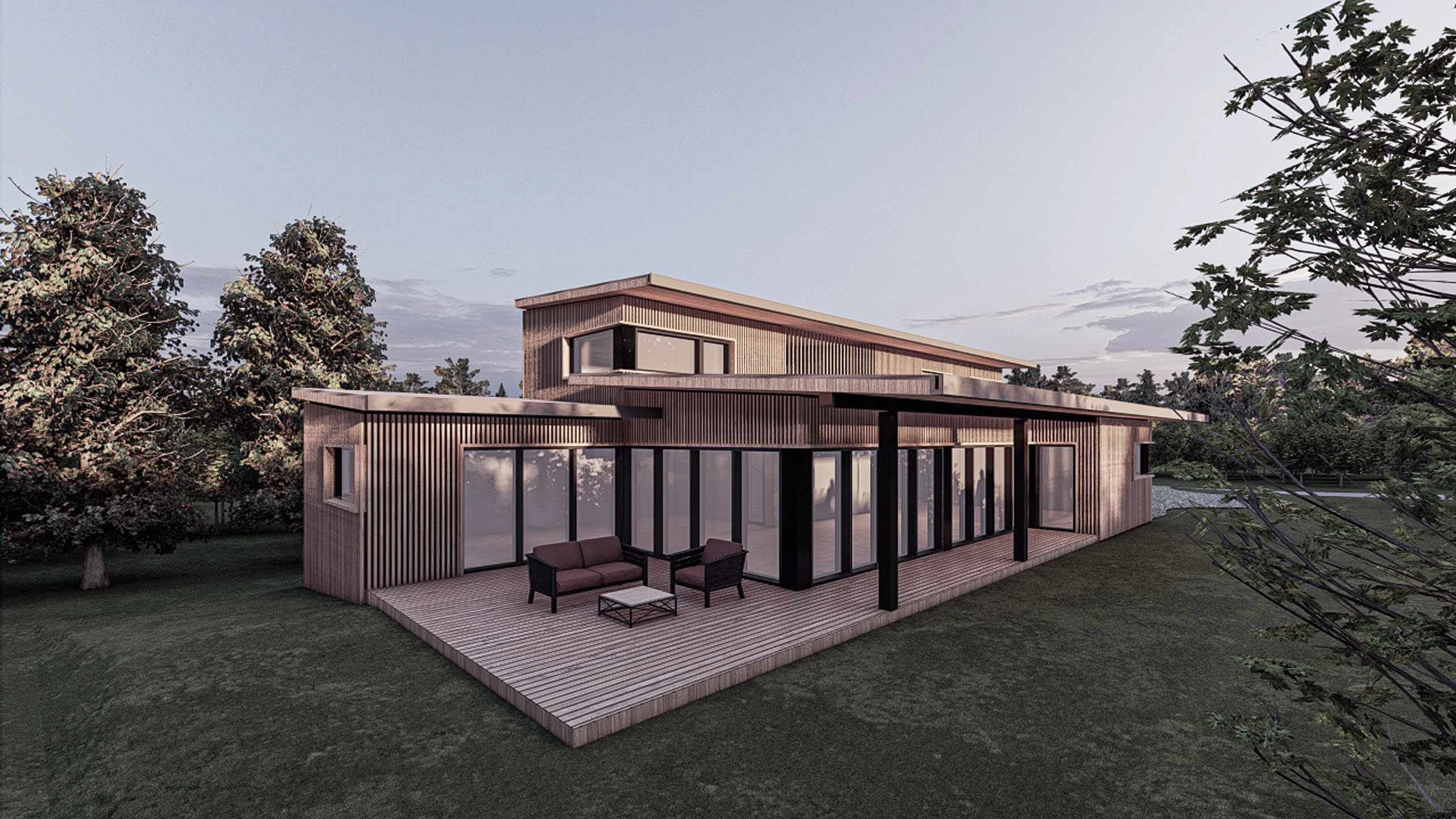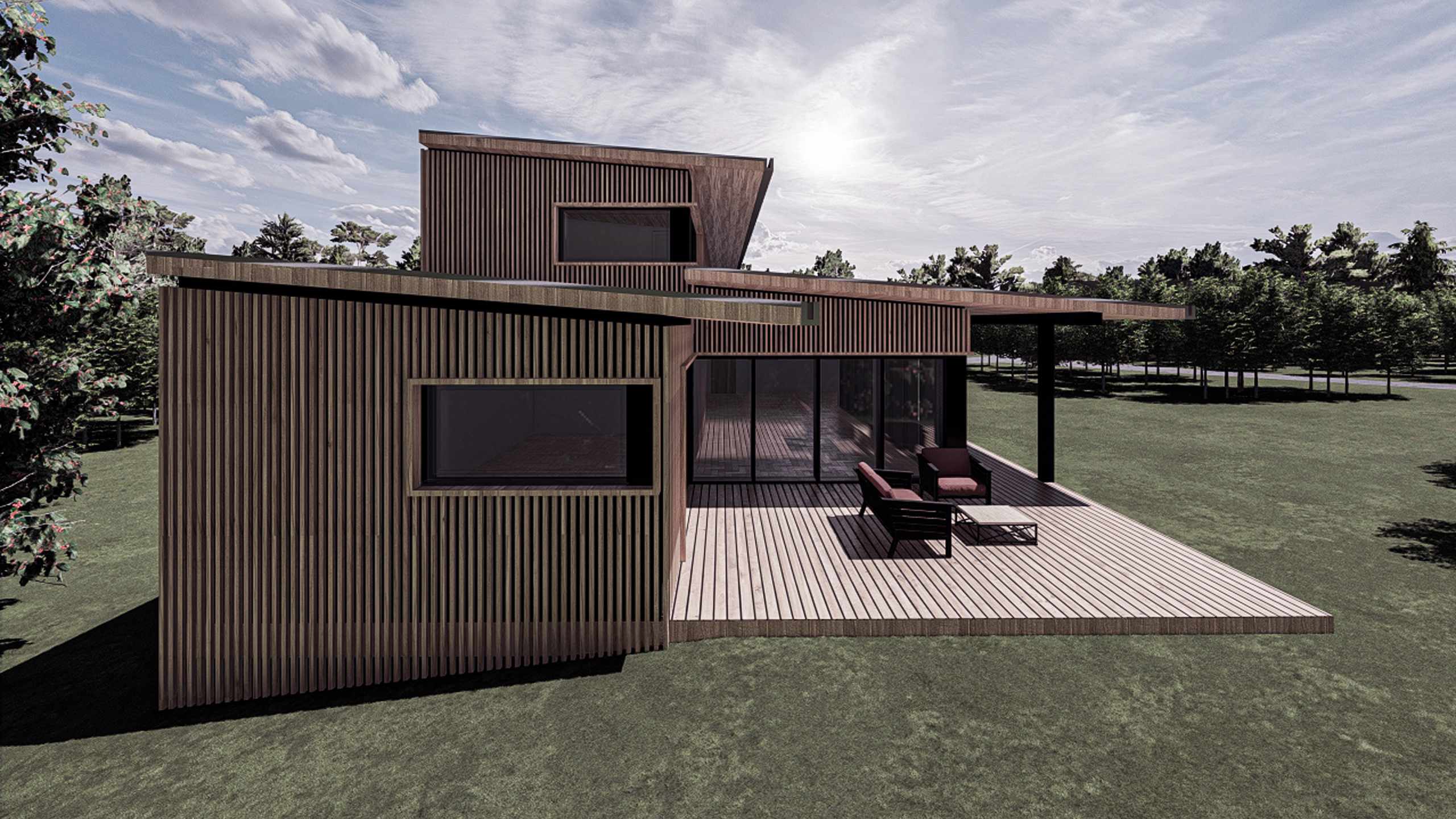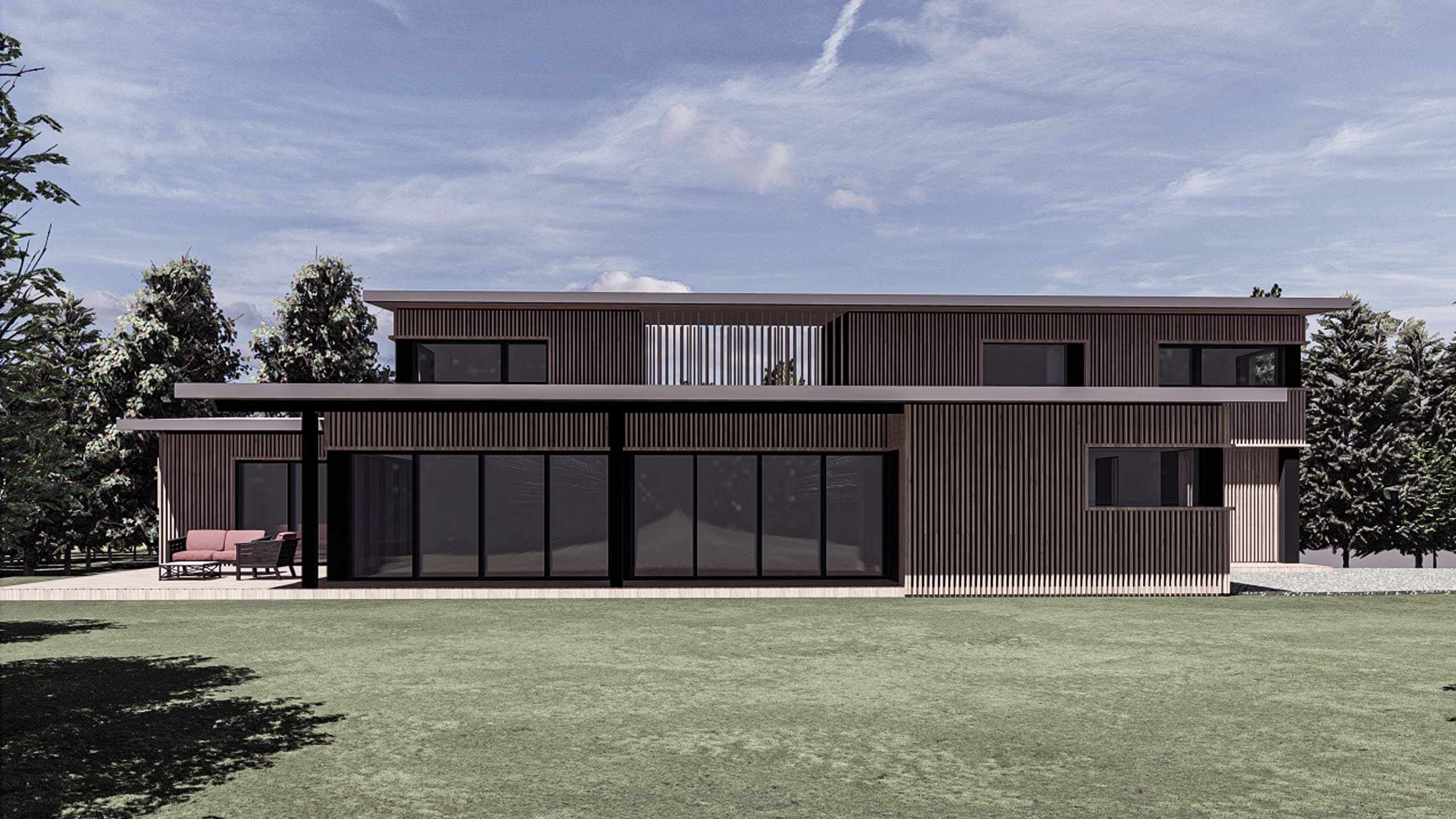 Côté Nord en direction de la construction voisine, la maison ne comporte pas d’ouvertures à l’exception d’une baie donnant vers un patio intérieur permettant une ventilation traversante des espaces de vie intérieurs. C’est sur le côté Sud où l’on retrouve des grandes ouvertures profitant de la lumière naturelle et de la vue vers la forêt. Les façades Ouest et Est accueillent d’une part la sortie vers la tersasse à l’Ouest et d’autre part l’entrée principale depuis la rue côté Est du terrain.