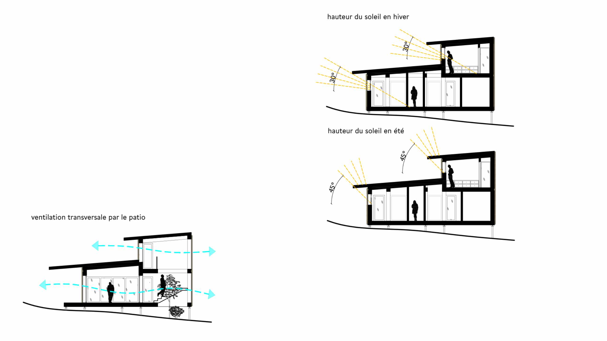 La forme de la maison a été conçue spécifiquement pour assurer la bonne protection du soleil en été tout en permettant des gains solaires considérables en hiver. Les débords de toiture ont été dimensionnés spécifiquement pour correspondre à l’azimut solaire à différents moments de l’année. En été, les baies vitrées sont parfaitement protégées tout au long de la journée tandis qu’en hiver, quand le soleil est plus bas, les rayons solaires pénètrent à l’intérieur apportant la chaleur.