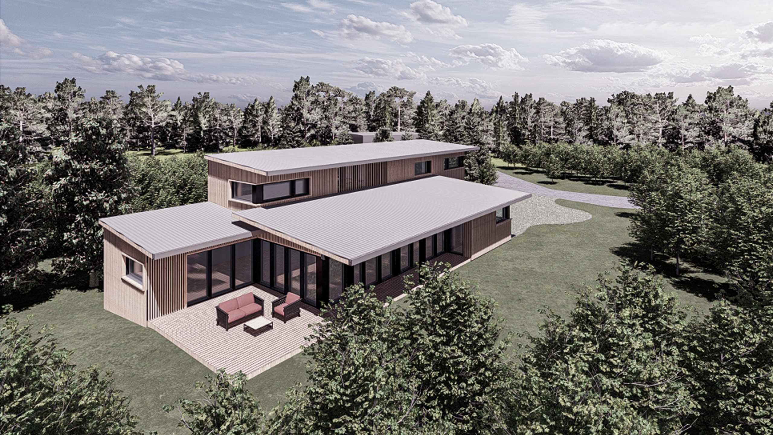 Le site du projet est localisé à Villemaréchal, la parcelle mesurant environ 40m en profondeur à partir de la route et 10m de largeur. Un volume sur deux niveaux correspondant à la hauteur du bâtiment voisin s’adosse sur la grande haie à limite nord de la parcelle et se développe ensuite en direction de la forêt sur un seul niveau. Il marque ainsi une transition progressive entre la typologie urbaine du village et l’espace naturel de la forêt. Les lignes horizontales marquées par les débords de toitures et la terrasse au sud renforcent le passage graduel entre les constructions et le paysage. Le projet vise à atteindre une haute performance environnementale par la qualité de son isolation thermique et le choix des matériaux et des équipements utilisés. Il met en place des solutions passives spécifiquement adaptées au contexte local.